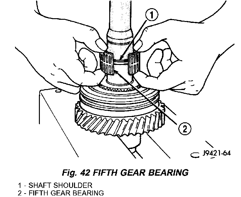 7. Install fifth gear bearing, spreading bearing only enough to clear shoulder on output shaft (Fig. 42). Verify bearing is seated.