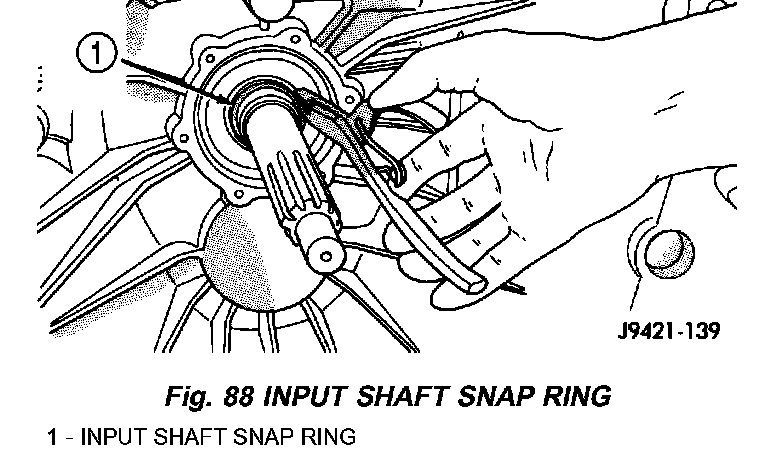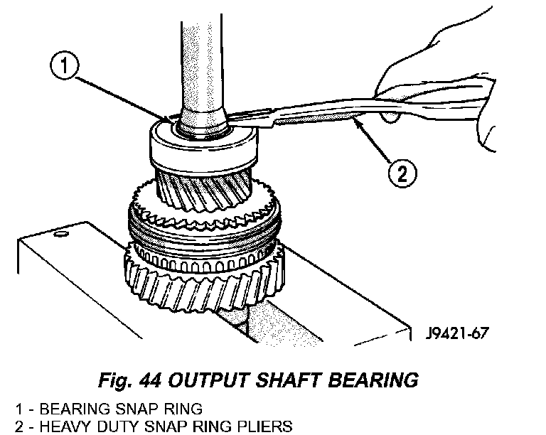 10. Install output shaft bearing snap ring, spread snap ring only enough to install it (Fig. 44). Verify snap ring is seated in shaft groove.
