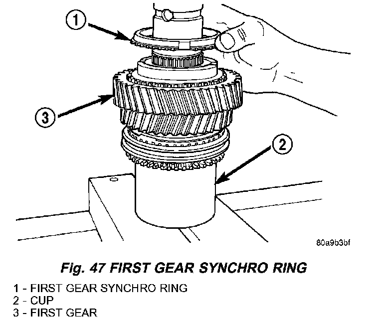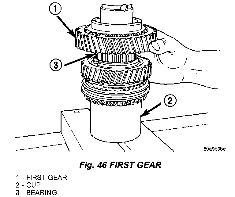 14. Install first gear on shaft and over bearing with bearing synchro cone facing up (Fig. 46).