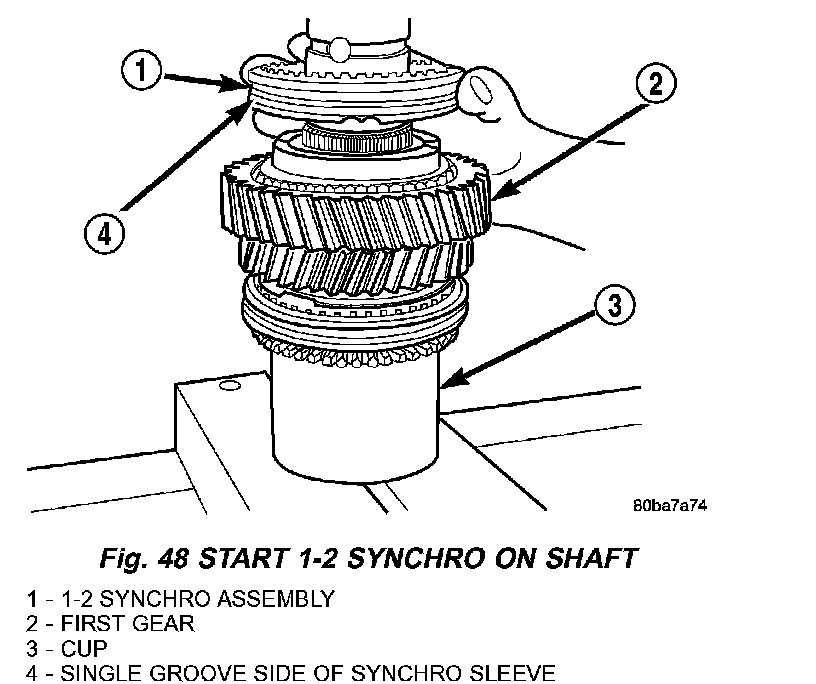 16. Start 1-2 synchro assembly on shaft by hand (Fig. 48). Be sure synchro sleeve is properly positioned.