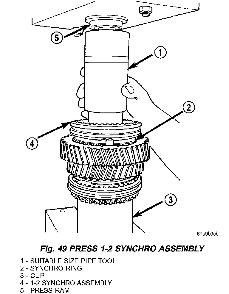 17. Press 1-2 synchro onto output shaft with suitable size pipe and shop press (Fig. 49).
