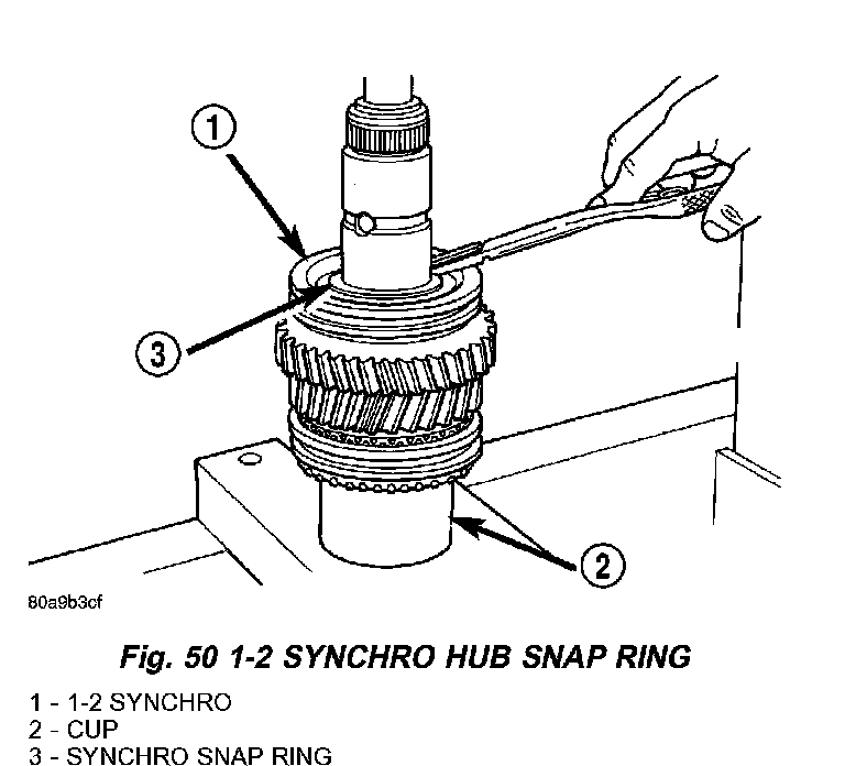 18. Install new 1-2 synchro hub snap ring (Fig. 50) with the thickest snap ring that will fit in shaft groove. Verify snap ring is seated in shaft groove.