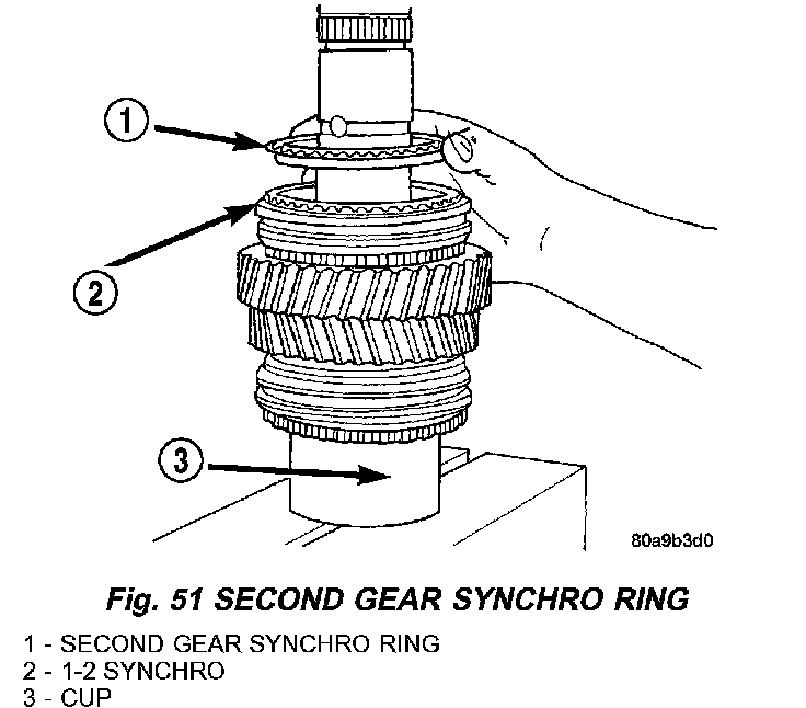 19. Install second gear synchro ring in 1-2 synchro hub and sleeve (Fig. 51). Verify synchro ring is seated in sleeve.