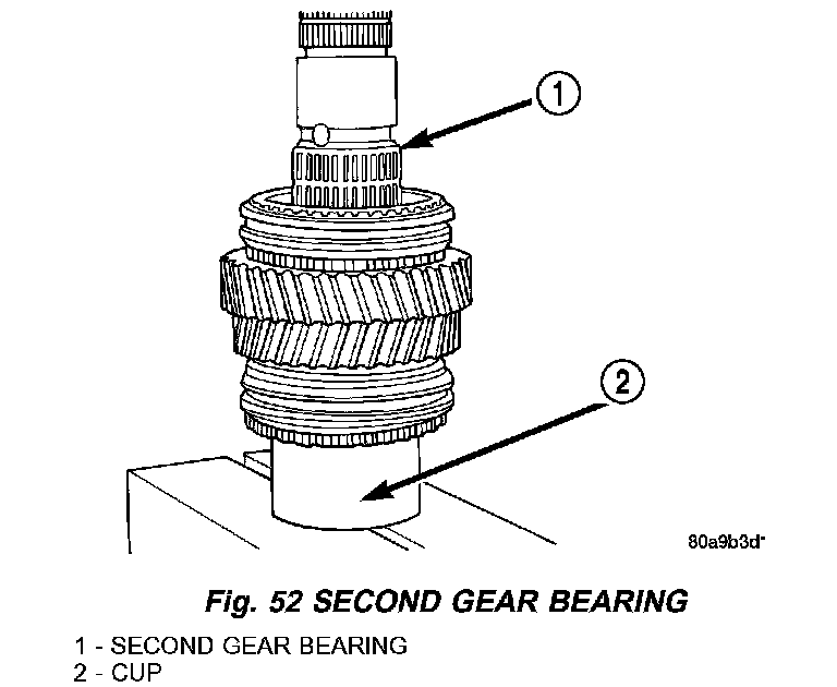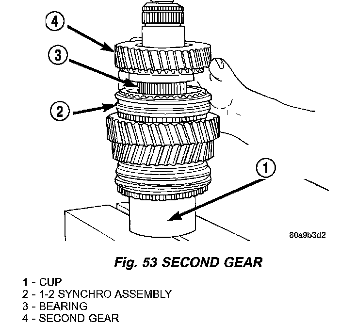22. Install second gear onto shaft and bearing (Fig. 53). Verify second gear is seated on synchro components.
