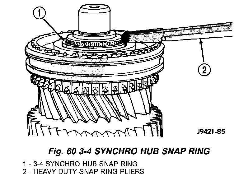 30. Install 3-4 synchro hub new snap ring (Fig. 60) with thickest snap ring that will fit in shaft groove. Verify snap ring is seated in groove.