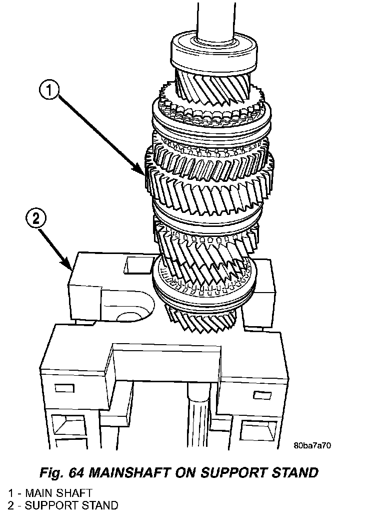 5. Slide countershaft into fixture slot. Verify countershaft and output shaft gears are fully meshed with the mainshaft gears (Fig. 65).