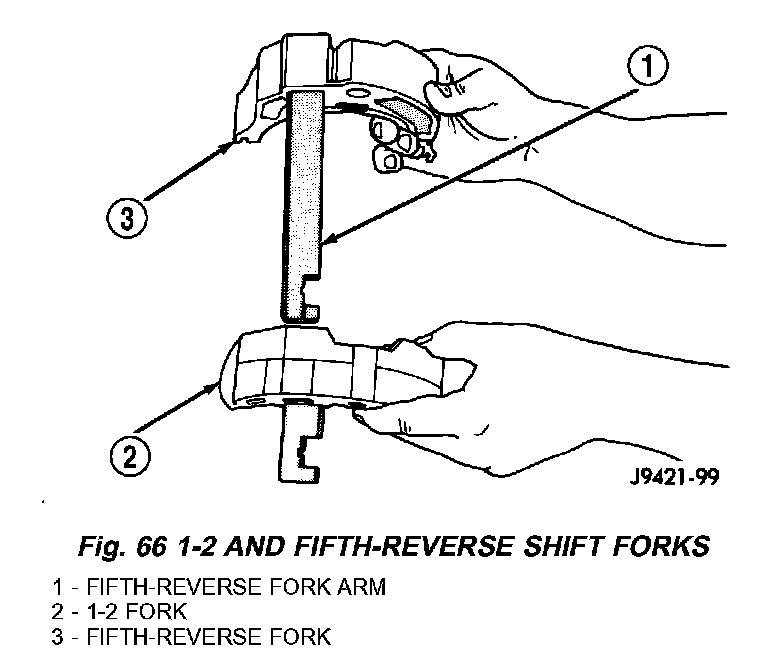 7. Assemble 1-2 and fifth reverse-shift forks (Fig. 66). Arm of fifth-reverse fork goes through slot in 1-2 fork.