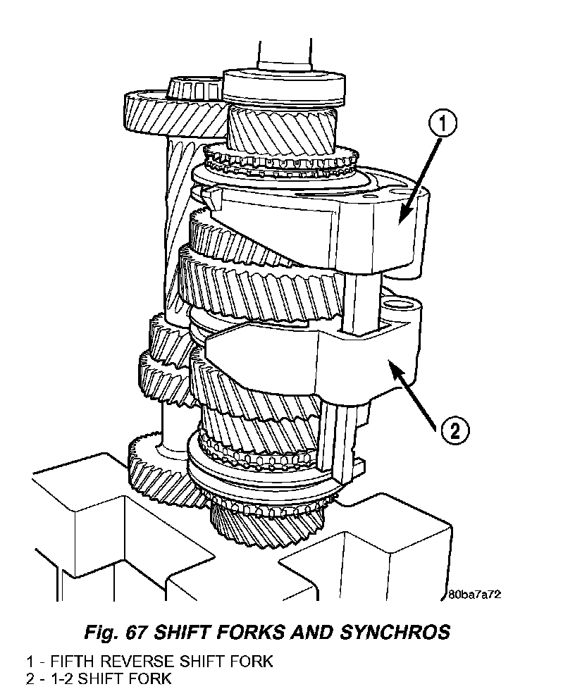8. Install assembled shift forks in synchro sleeves (Fig. 67). Verify forks are seated in sleeves.