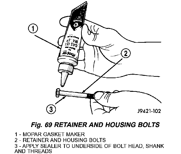 4. Apply Mopar Gasket Maker or equivalent to bolt threads, bolt shanks and under bolt heads (Fig. 69).