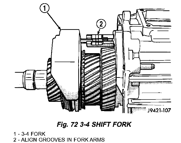 2. Install 3-4 shift fork in synchro sleeve (Fig. 72). Verify groove in fork arm is aligned with grooves in 1-2 and fifth-reverse fork arms.