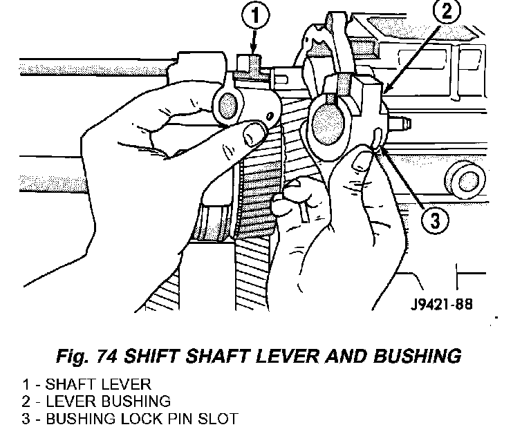 4. Assemble shift shaft shift lever and bushing (Fig. 74). Slot in bushing must face up and roll pin hole for lever to align with hole in shaft.