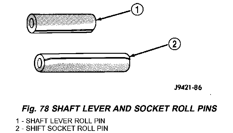 9. Select correct new roll pin for shift shaft lever (Fig. 78). Shaft lever roll pin is approximately 22 mm (7/8 in.) long. Shift socket roll pin is approximately 33 mm (1-1/4 in.) long.