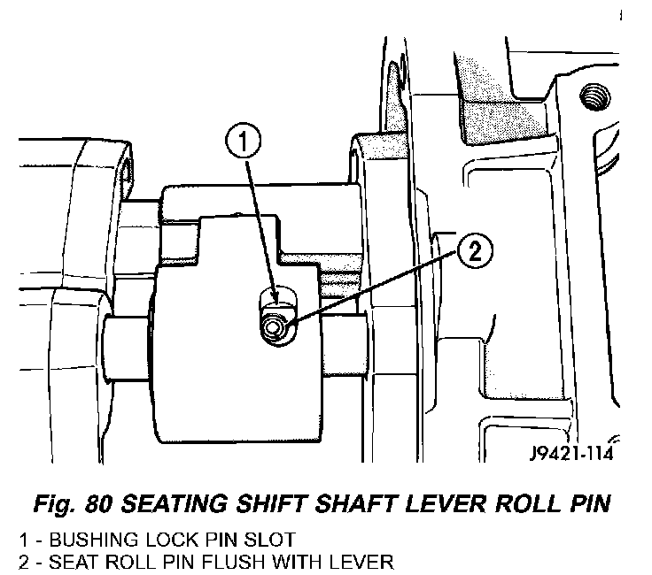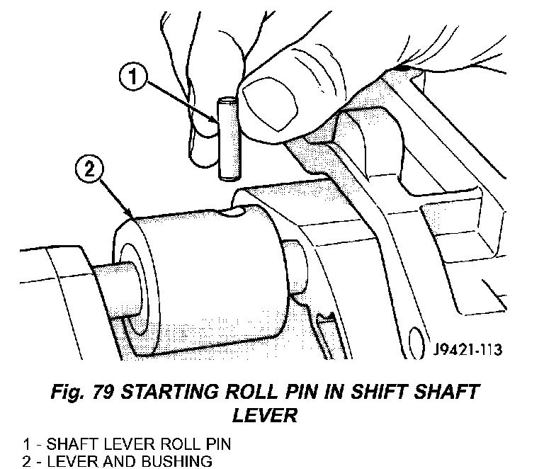 10. Align roll pin holes in shift shaft, lever and bushing, then start roll pin into shaft lever by hand (Fig. 79).