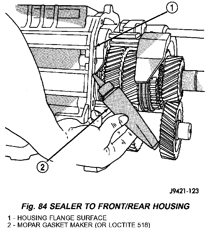 3. Apply 1/8 in. wide bead of Mopar Gasket Maker or equivalent to mating surfaces of front and rear housings (Fig. 84).