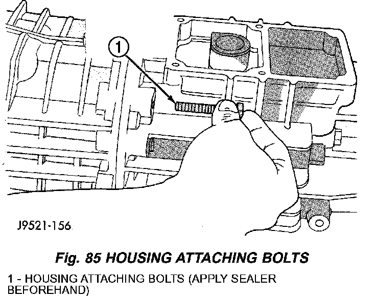 7. Apply Mopar Gasket Maker or equivalent to housing attaching bolts. Apply sealer material sealer to underside of bolt heads and to bolt shanks and threads (Fig. 85).