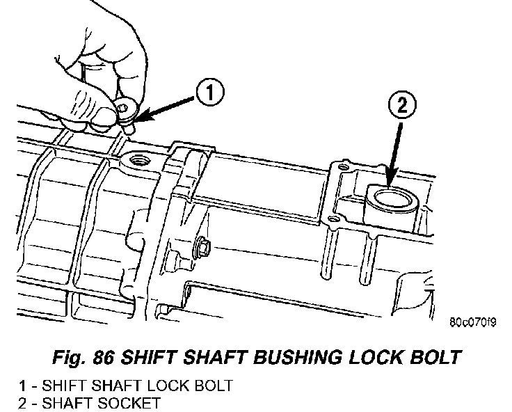 9. Install shift shaft bushing lock bolt (Fig. 86). Apply Mopar Gasket Maker or equivalent to bolt threads, shank and underside of bolt head before installation.