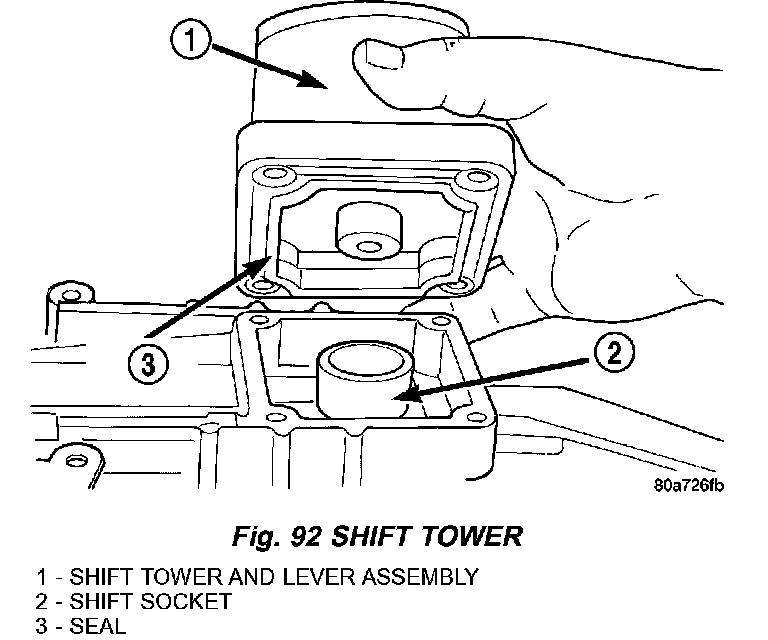 3. Align and install shift tower and lever assembly (Fig. 92). Verify shift ball is seated in socket and offset in the tower is toward the passenger side of the vehicle before installing tower bolts.