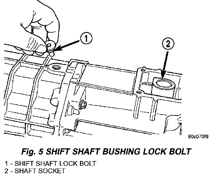 5. Remove shift shaft lock bolt (Fig. 5). Bolt secures the shift shaft bushing and lever.