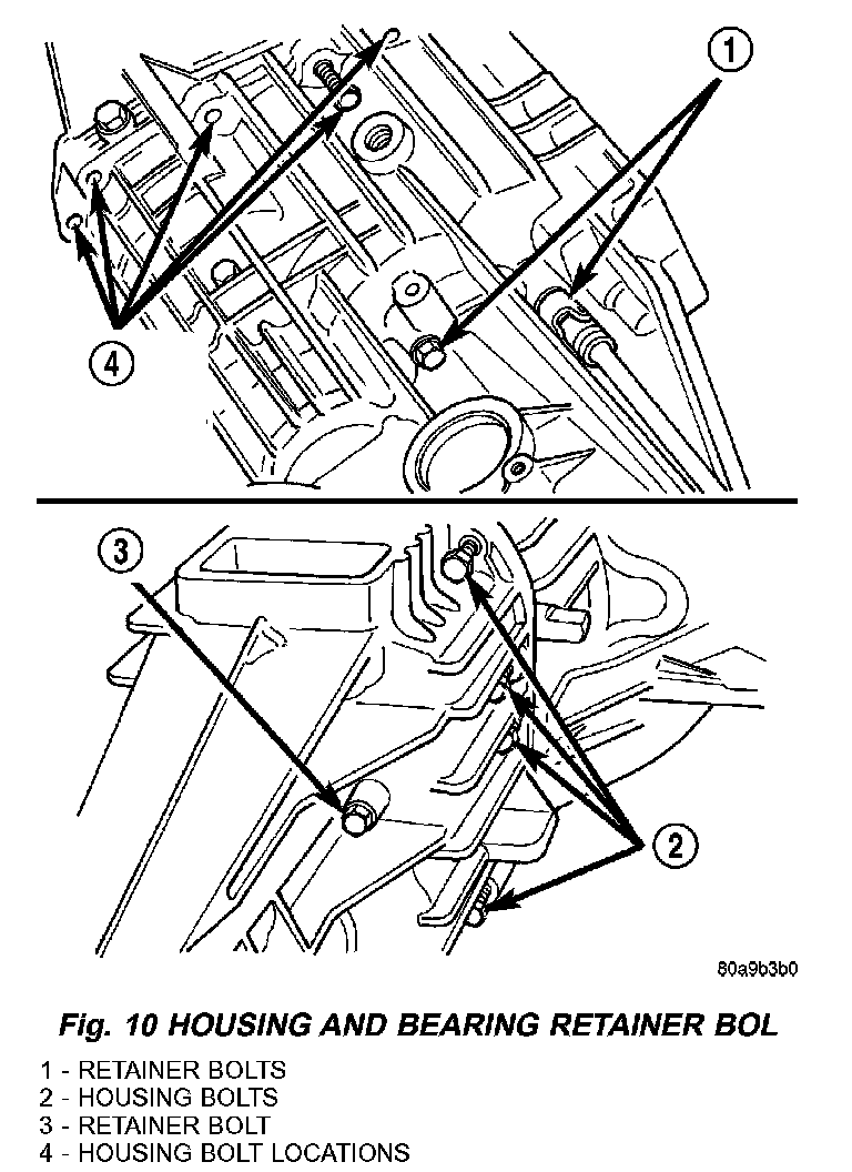 11. Remove front housing bolts (Fig. 10). Leave one bolt in place until geartrain is ready to be removed from case. Three bolts at the rear of housing are for the output shaft bearing retainer.