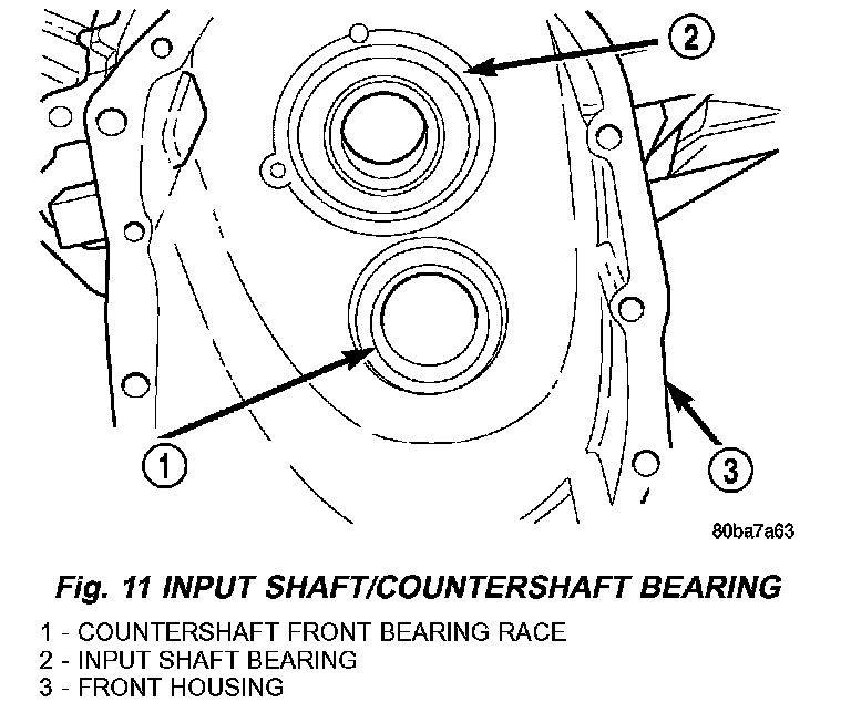 NOTE: The front housing contains the countershaft front bearing race. The rear housing contains the countershaft rear bearing race. If a countershaft bearing failure results, the bearing races must be replaced also.