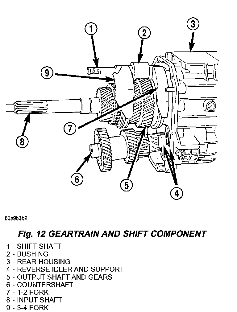 14. Note position of input shaft, shift shaft, forks, and geartrain components in housing (Fig. 12).