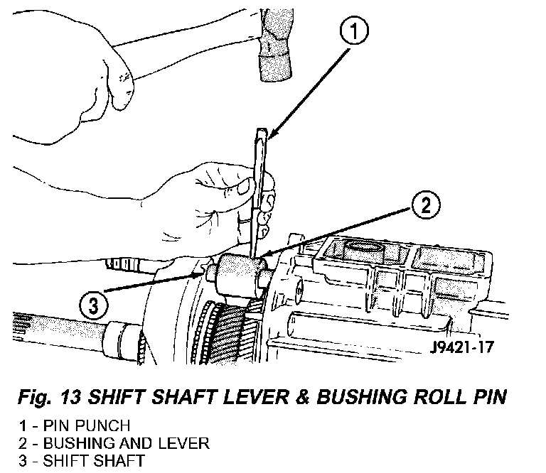 1. Drive out roll pin that secures shift bushing and lever to shift shaft with a hammer and punch (Fig. 13).