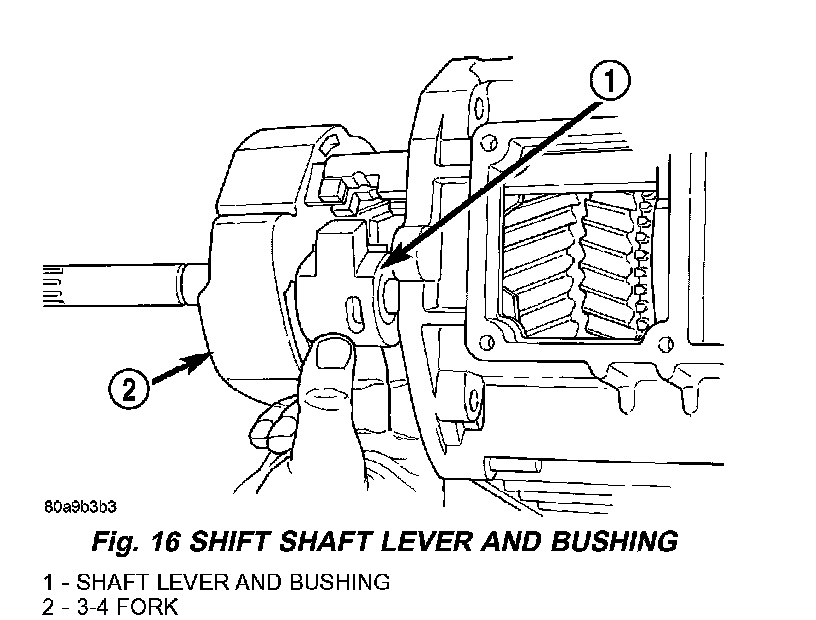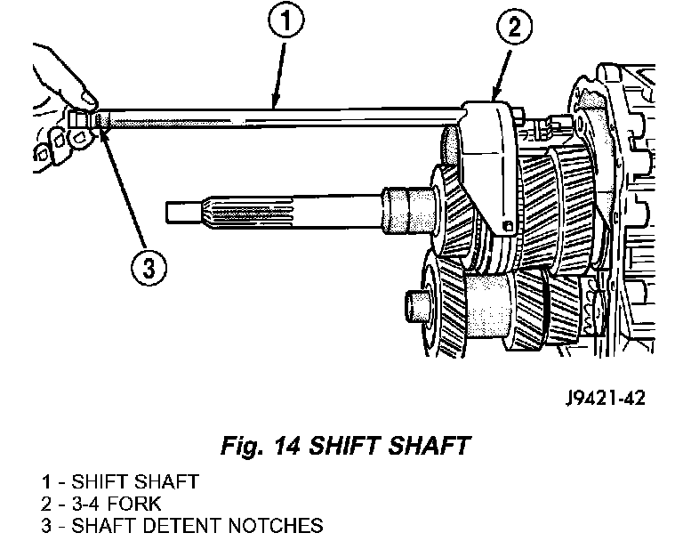 4. Pull shift shaft straight out of rear housing and shift forks (Fig. 14).