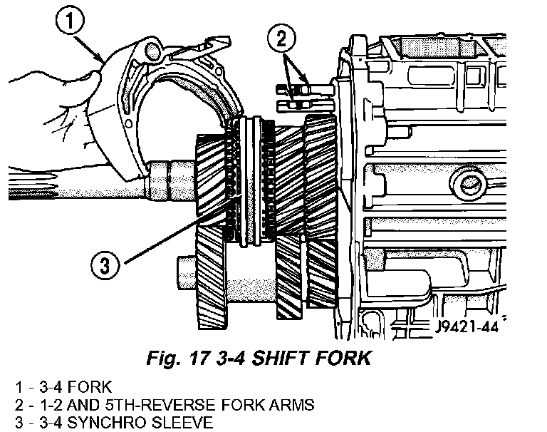 7. Rotate 3-4 fork around synchro sleeve until fork clears shift arms on 1-2 and fifth-reverse forks, then remove 3-4 fork (Fig. 17).