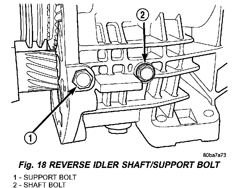 8. Remove front reverse idler shaft support bolt and loosen rear bolt (Fig. 18).
