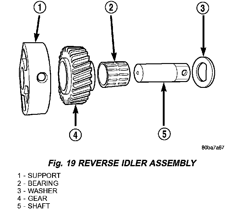 11. Remove reverse idler shaft, idler gear, bearing and thrust washer (Fig. 19).