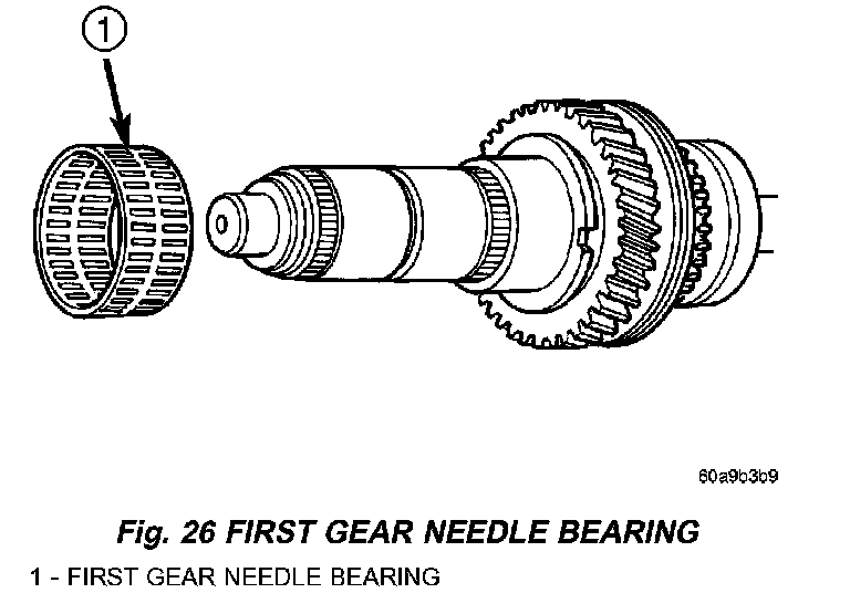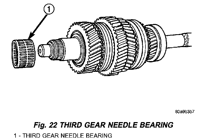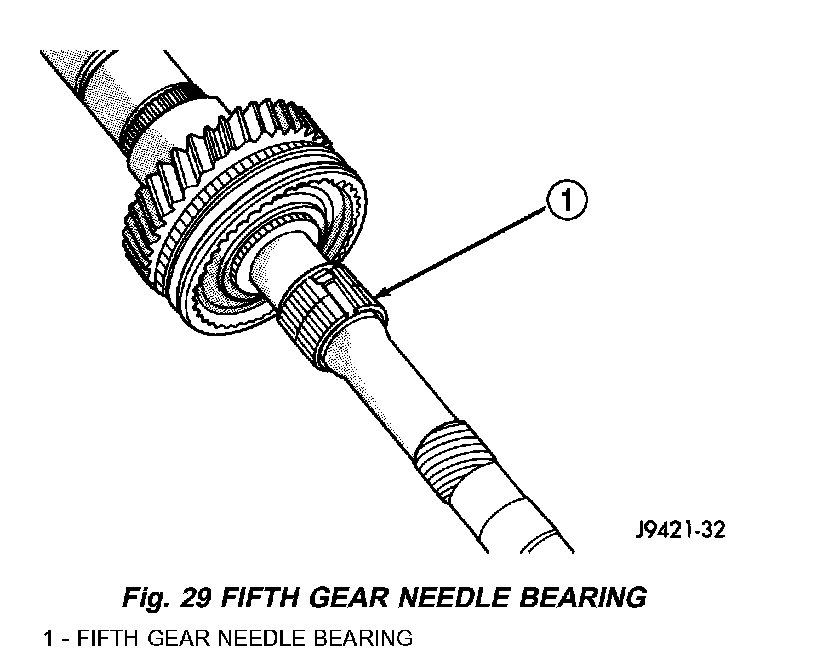 15. Remove fifth gear needle bearing. Spread bearing apart just enough to clear shoulder on output shaft (Fig. 29).