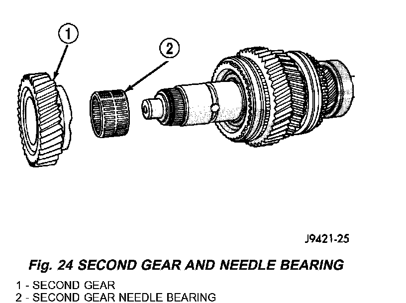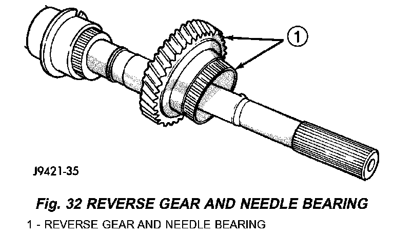 Inspect idler gear, bearing, shaft, thrust washer and support for excessive wear or failure (Fig. 34). Replace bearing if any of the needle bearing rollers are worn, chipped, cracked, flat-spotted or brinnelled. Also replace the bearing if the plastic bearing cage is damaged or distorted.