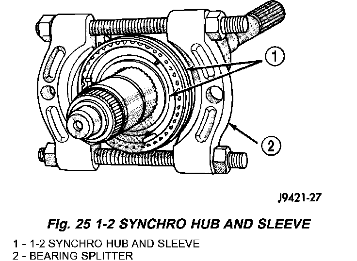 10. Remove 1-2 synchro hub and sleeve and first gear from output shaft with shop press and Splitter 1130 (Fig. 25). Position splitter between first and reverse gears.