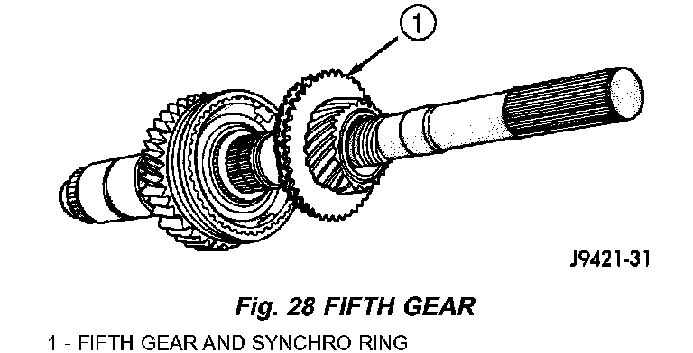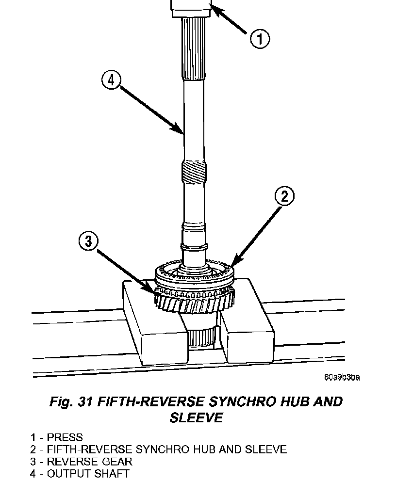 17. Remove fifth-reverse synchro hub and sleeve with shop press (Fig. 31).