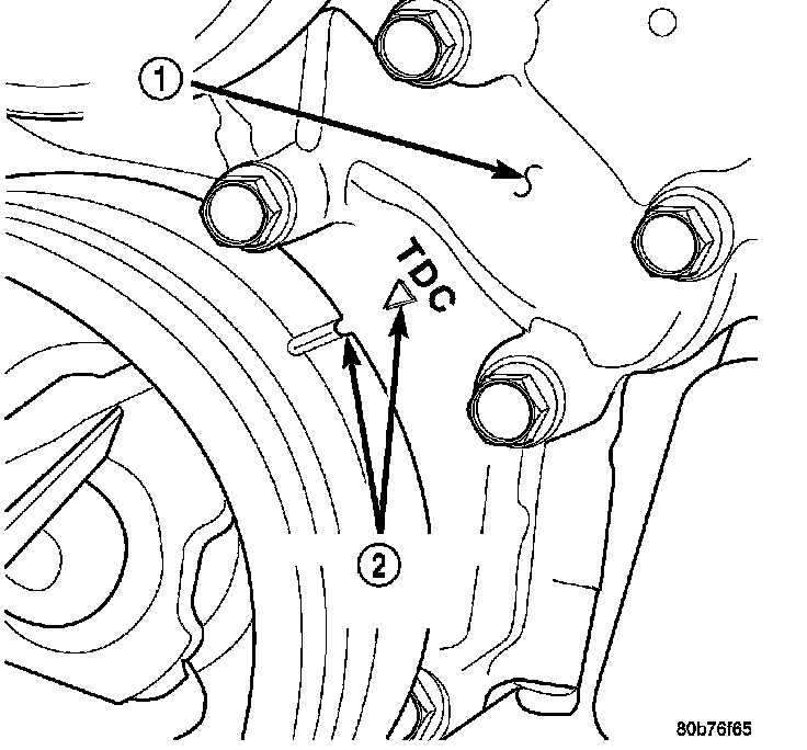 2. Using a mirror, locate the TDC arrow (2) on the front cover (1). Rotate the crankshaft until the mark on the crankshaft damper is aligned with the TDC arrow on the front cover. The engine is now at TDC.