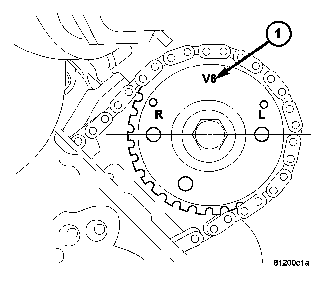 3. Note the location of the V6 mark (1) stamped into the camshaft drive gears. If the V6 mark on each camshaft drive gear is at the twelve o'clock position, the engine is at TDC on the exhaust stroke. If the V6 mark on each gear is at the six o'clock position, the engine is at TDC on the compression stroke.