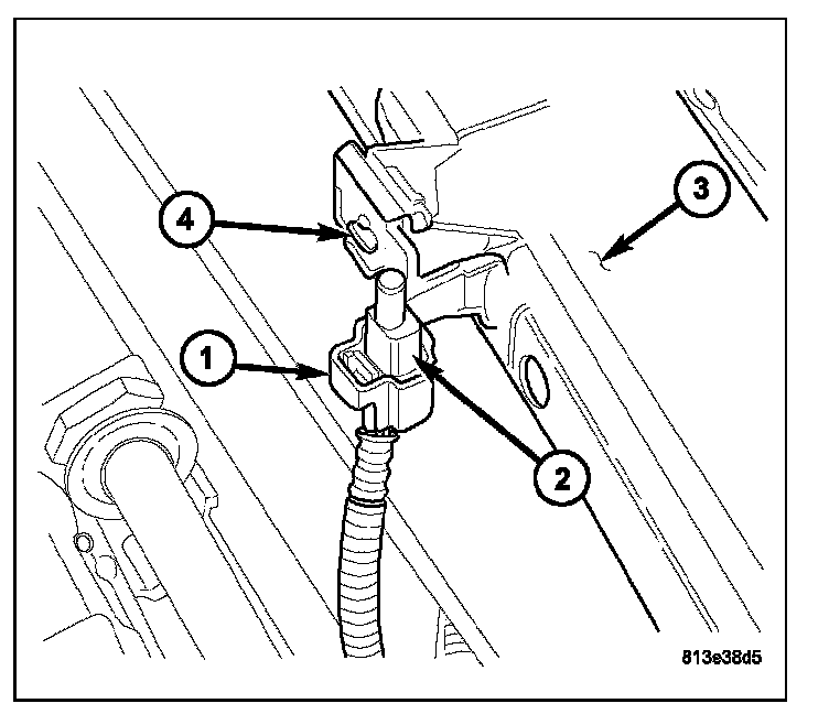 1. Install the ambient air temperature sensor (2) onto the top of the front bumper beam (3). Make sure that the retaining tabs (4) are fully engaged.