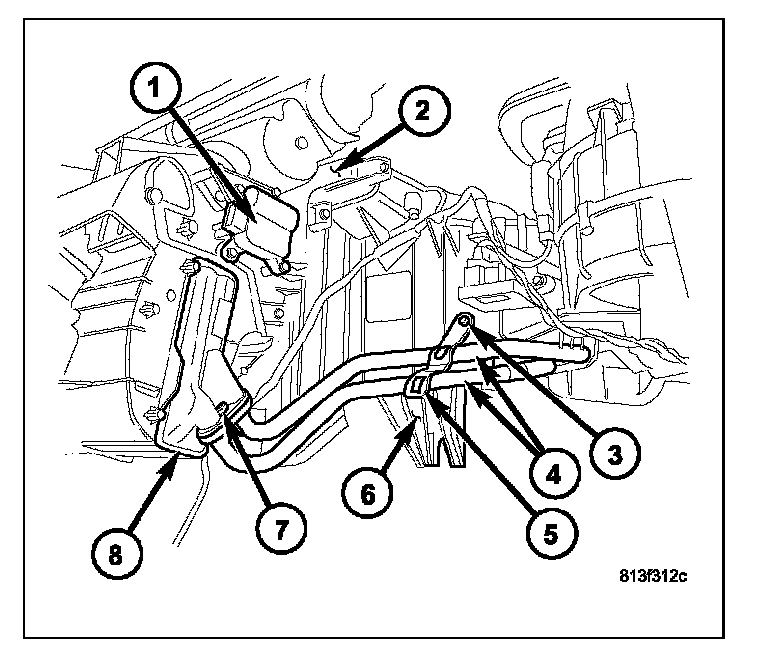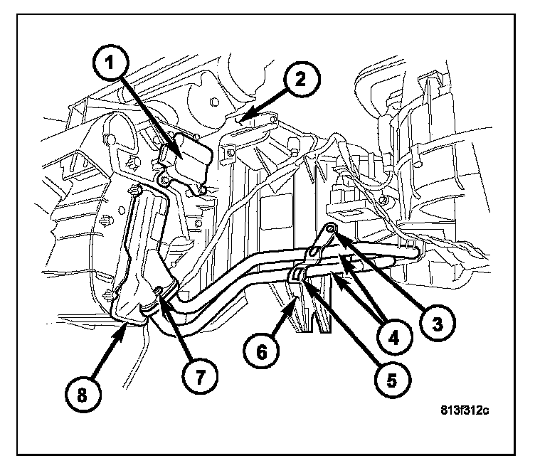 9. Remove the bolt (7) that secures the heater tubes to the heater core (8).