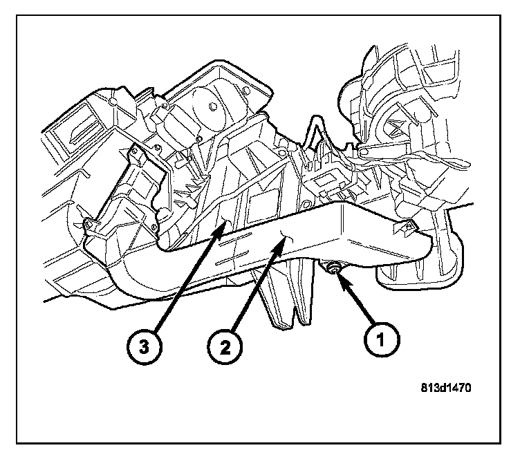 5. Remove the five screws (1) that secure the heater core and tube cover (2) to the HVAC housing (3).