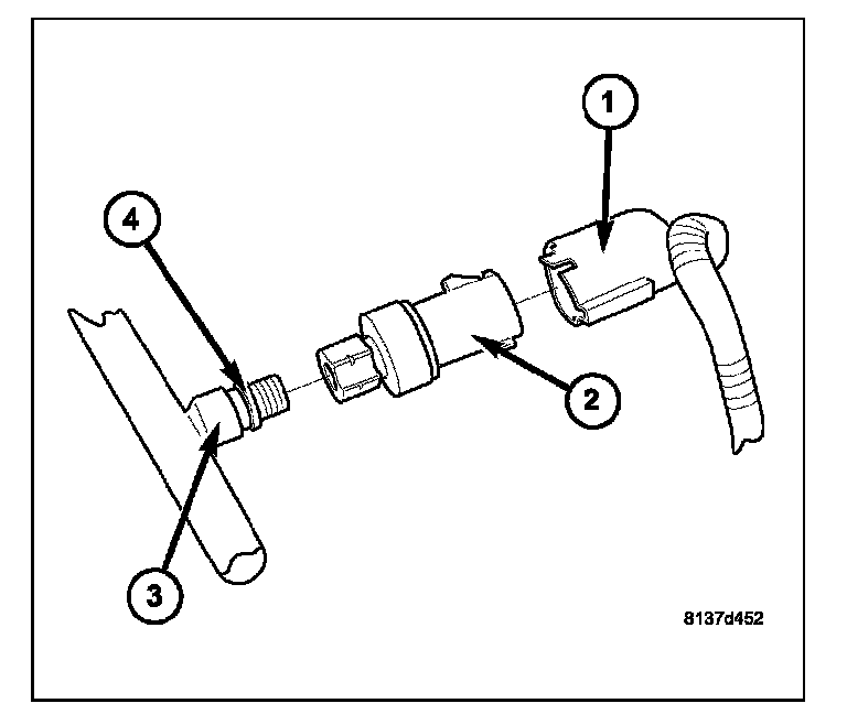 3. Remove the A/C pressure transducer from the fitting on the A/C discharge line and remove and discard the O-ring seal.