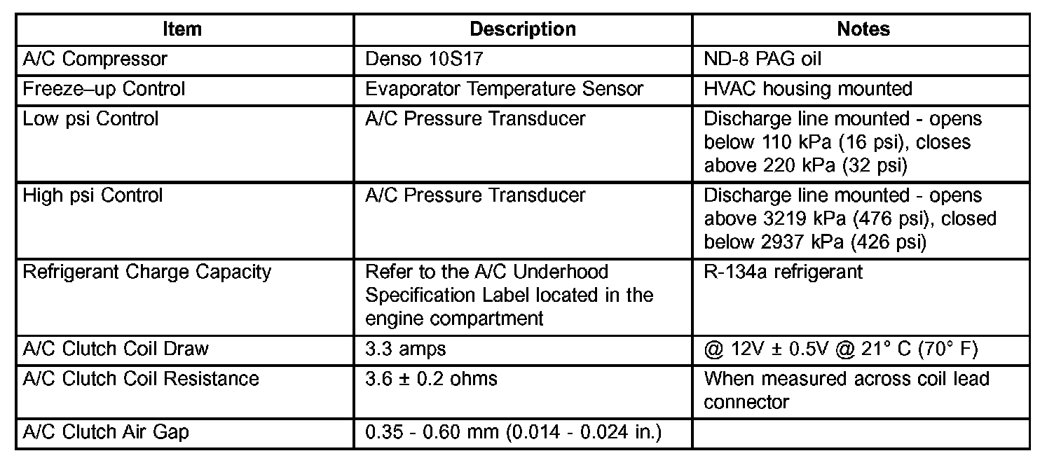 Specifications - A/C System: