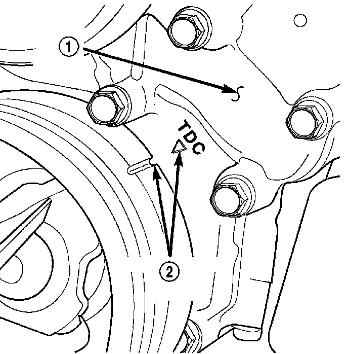 Timing mark (2) on crankshaft damper aligns with TDC mark on timing chain cover (1).