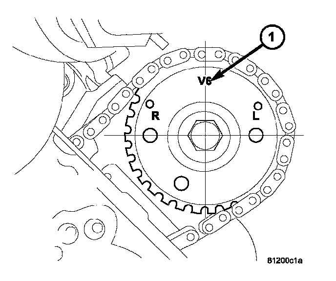 Camshaft sprocket "V6" marks (1) are at the 12 o'clock position (No. 1 TDC exhaust stroke).