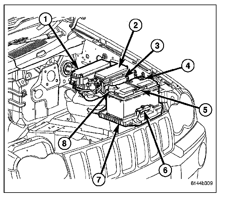 The IPM (2) is located in the engine compartment,next to the battery (5) and in front of the Power Distribution Center (PDC) (1). It is secured to a bracket with three locating slots that snap onto the bracket tabs holding it securely in place. The printed circuit board portion of the IPM cannot be repaired and must be replaced if inoperative or damaged.