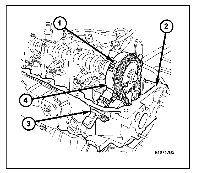 The Camshaft Position Sensor (CMP) on the 3.7L 6-cylinder engine is bolted to the right-front side of the right cylinder head.The Camshaft Position Sensor (CMP) sensor on the 3.7L V-6 engine (3) contains a hall effect device referred to as a sync signal generator. A rotating target wheel (tonewheel) for the CMP is located (4) at the front of the camshaft for the right cylinder head (2). This sync signal generator detects notches (1) located on a tonewheel. As the tonewheel rotates, the notches pass through the sync signal generator. The signal from the CMP sensor is used in conjunction with the Crankshaft Position Sensor (CKP) to differentiate between fuel injection and spark events. It is also used to synchronize the fuel injectors with their respective cylinders.