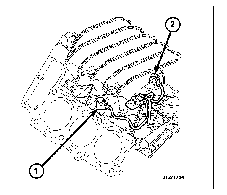 NOTE: The left sensor is identified by an identification tag (LEFT). It is also identified by a larger bolt head. The Powertrain Control Module (PCM) must have and know the correct sensor left/right positions. Do not mix the sensor locations.