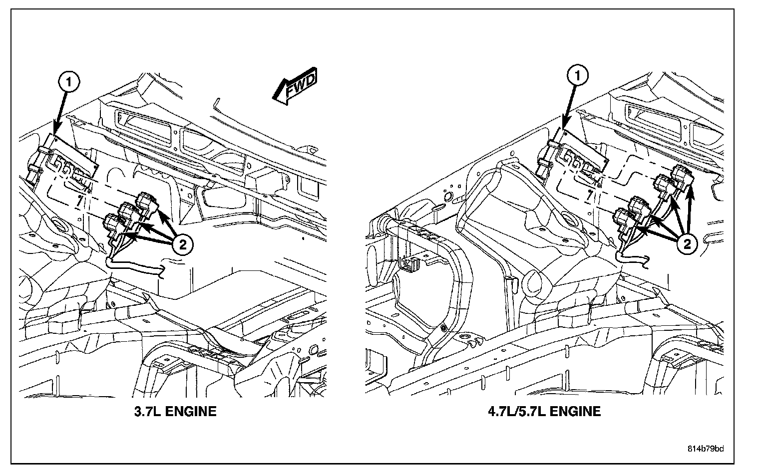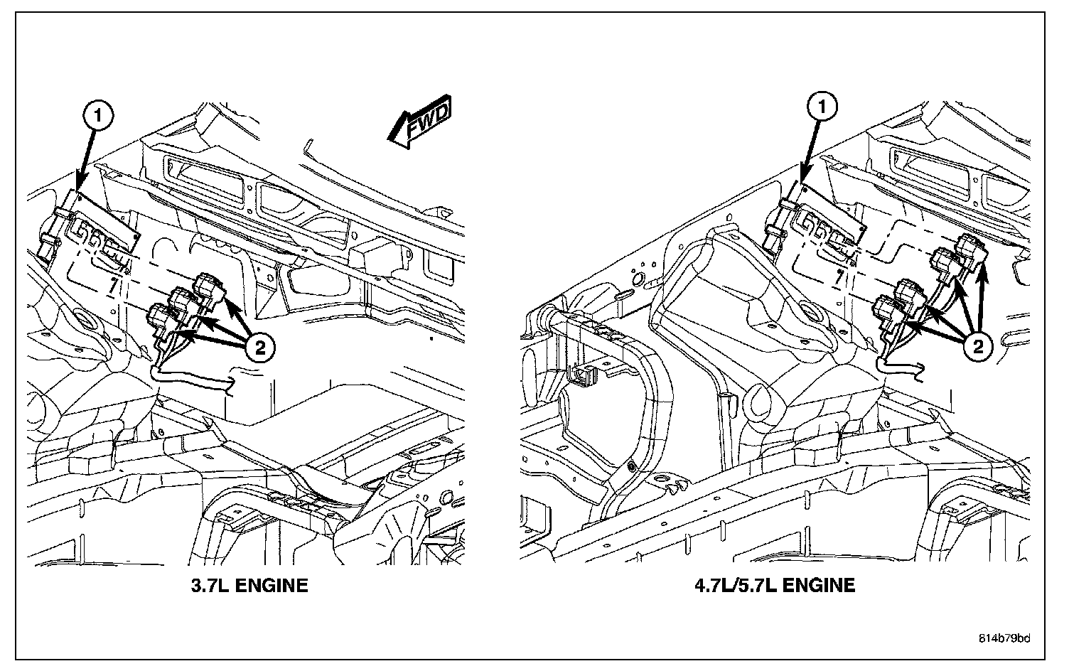The PCM (1) is attached to the right-front inner fender located in the engine compartment.
