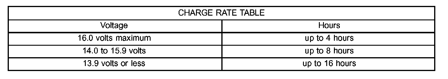 3. Battery chargers vary in the amount of voltage and current they provide. The amount of time required for a battery to accept measurable charging current at various voltages is shown in the Charge Rate Table. If the charging current is still not measurable at the end of the charging time, the battery is inoperative and must be replaced. If the charging current is measurable during the charging time, the battery may be good and the charging should be completed in the normal manner.