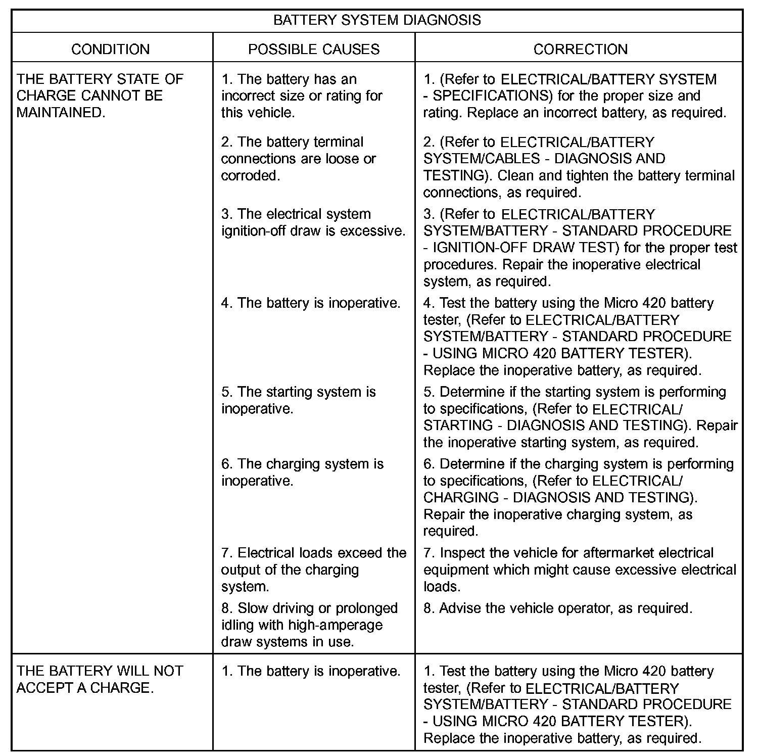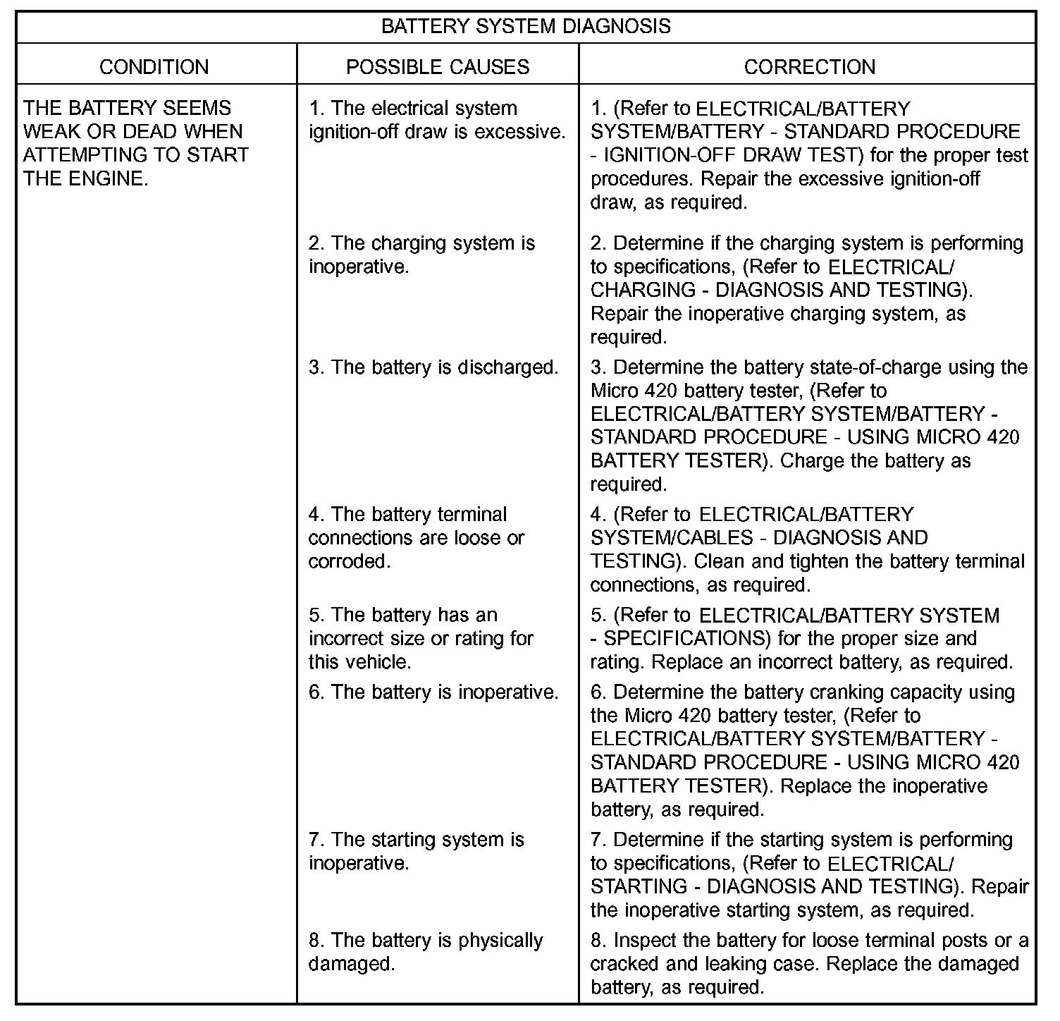The Micro 420 automotive battery system tester is designed to help diagnose the cause of a defective battery. (Refer to MICRO 420 BATTERY TESTER) for directions on using the Micro 420 battery tester. Micro 420 Battery Tester
