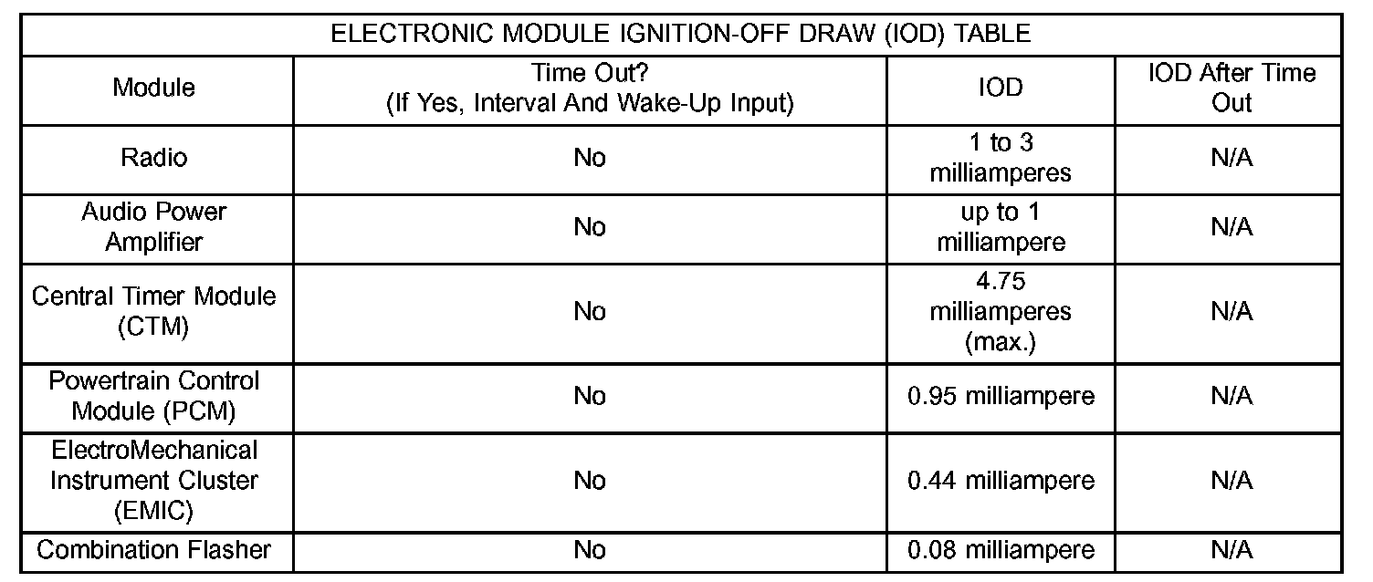 The term Ignition-Off Draw (IOD) identifies a normal condition where power is being drained from the battery with the ignition switch in the Off position. A normal vehicle electrical system will draw from five to thirty-five milliamperes (0.005 to 0.035 ampere) with the ignition switch in the Off position, and all non-ignition controlled circuits in proper working order. Up to thirty-five milliamperes are needed to enable the memory functions for the Powertrain Control Module (PCM), digital clock, electronically tuned radio, and other modules which may vary with the vehicle equipment.A vehicle that has not been operated for approximately twenty days, may discharge the battery to an inadequate level. When a vehicle will not be used for twenty days or more (stored), remove the IOD fuse from the Junction Block (JB). This will reduce battery discharging.
